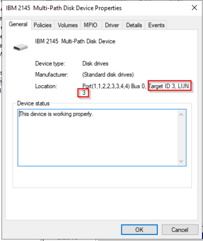 Now go in the Windows Disk Manager and look for properties of disks to find out the Target and LUN ID corresponding
