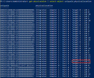 Get-PhysicalDisk | Select-Object UniqueID,PhysialLocation